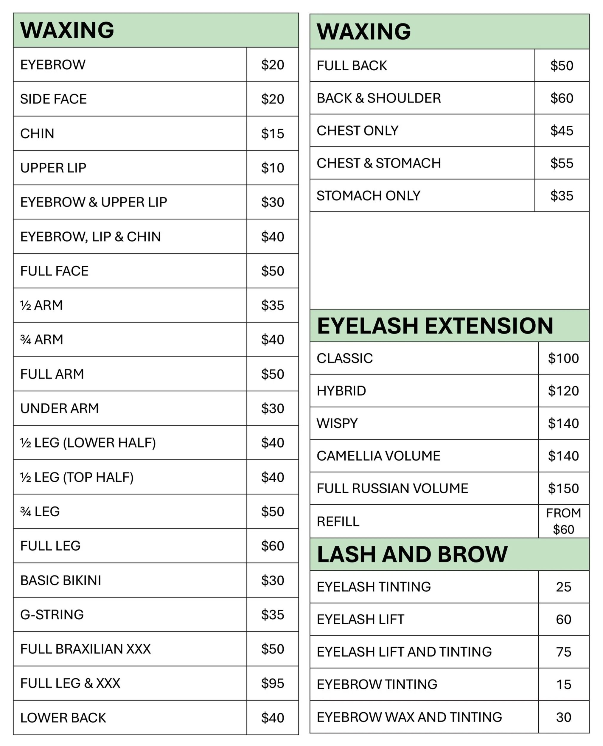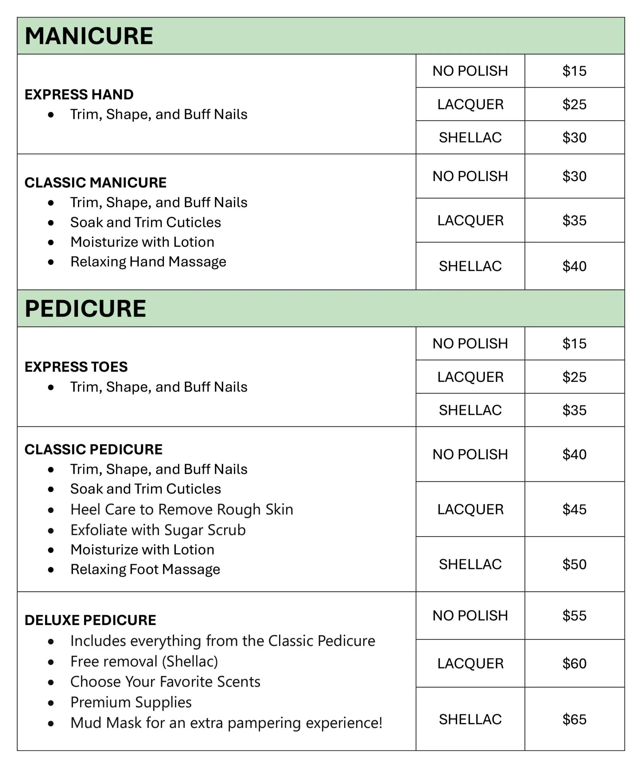 Prices listed are for main services only and don’t include optional add-ons.